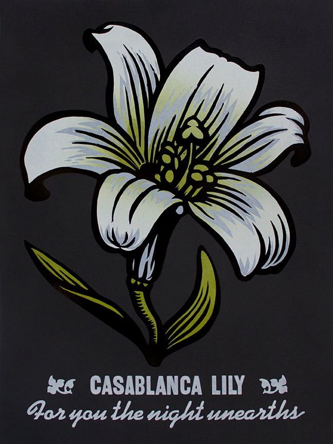 Martin Mazorra's Language of Flowers, Night Blooming Series, Color Woodcut and Letterpress print, 24" x 18", on French's 100 lb. Cover, Insulation Pink. Handcut, Handprinted with moveable type. Signed. Unframed. Edition of 20.