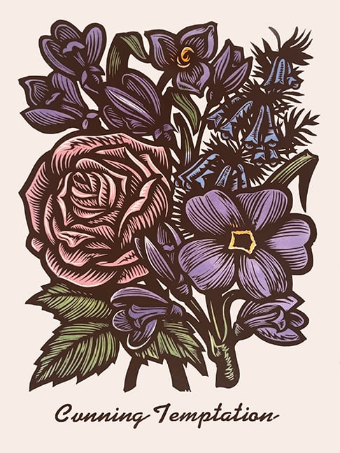 Color Woodcut and Letterpress print, 24" x 18", on French's 100 lb. Cover, Insulation Pink. Handcut, Handprinted with moveable type. Signed. Unframed. Edition of 20.