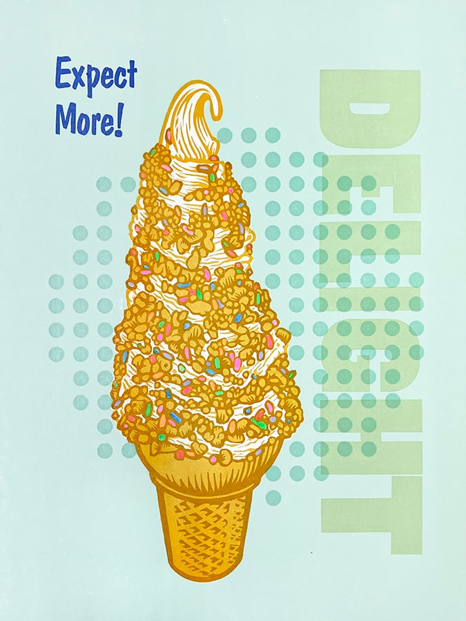 Color Woodcut, Relief and Letterpress print, 18" x 24", on Savoy Bright White cotton paper. Hand-cut, Hand-printed with antique wooden type.