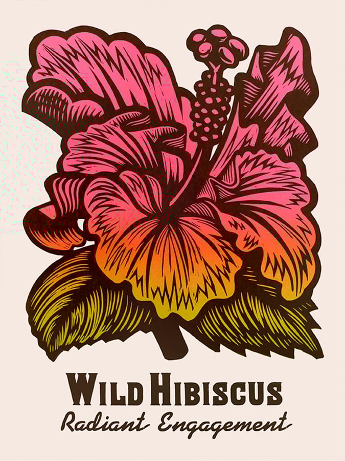 Color Woodcut and Letterpress print, 18" x 24", on French's 100 lb. Cover, Insulation Pink. Handcut, Handprinted with moveable type. Signed. Unframed. Fits in a standard size frame. Edition of 20.