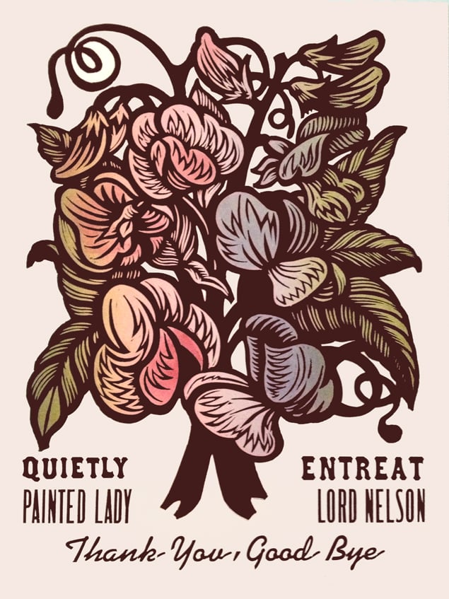 Color Woodcut and Letterpress print, 18" x 24", on French's 100 lb. Cover, Insulation Pink. Handcut, Handprinted with moveable type. Signed. Unframed. Fits in a standard size frame. Edition of 20.