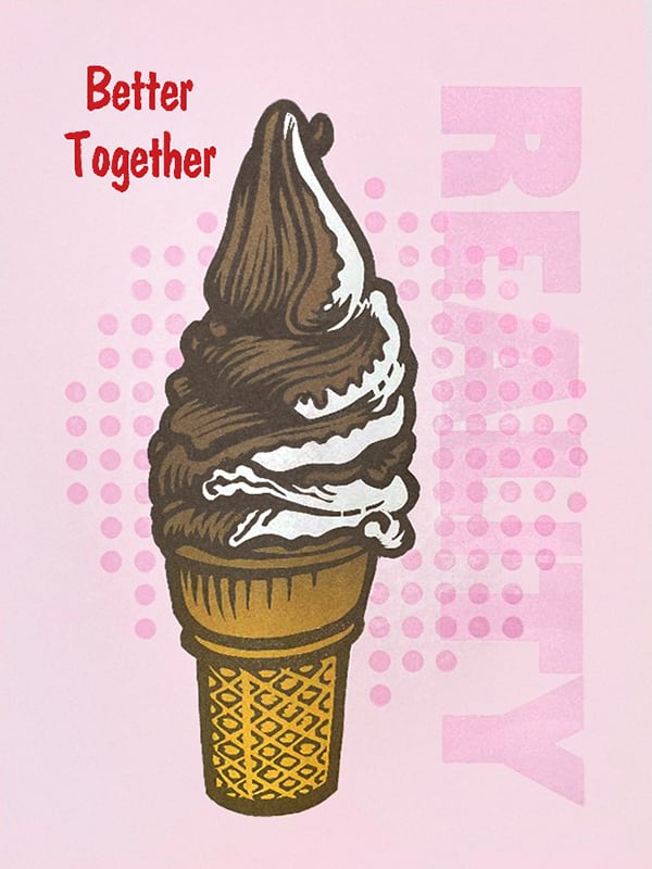 Color Woodcut, Relief and Letterpress print, 18" x 24", on Bright White cotton paper. Hand-cut, Hand-printed with antique wooden type. 2020. Signed on the front. Unframed.