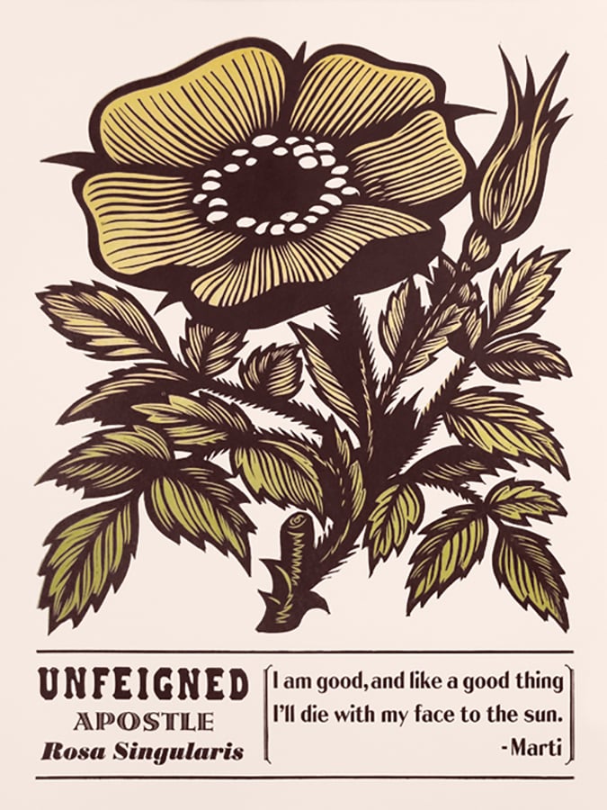 Martin Mazorra's Language of Flowers, Rose series, Color Woodcut and Letterpress print, 18" x 24", on French's 100 lb. Cover, Insulation Pink. Handcut, Handprinted with moveable type. Signed. Unframed. Fits in a standard size frame. Edition of 20.