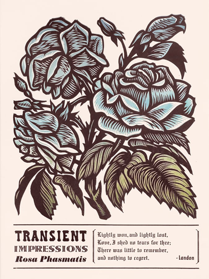 Color Woodcut and Letterpress print, 18" x 24", on French's 100 lb. Cover, Insulation Pink. Handcut, Handprinted with moveable type. Signed. Unframed. Fits in a standard size frame. Edition of 40.