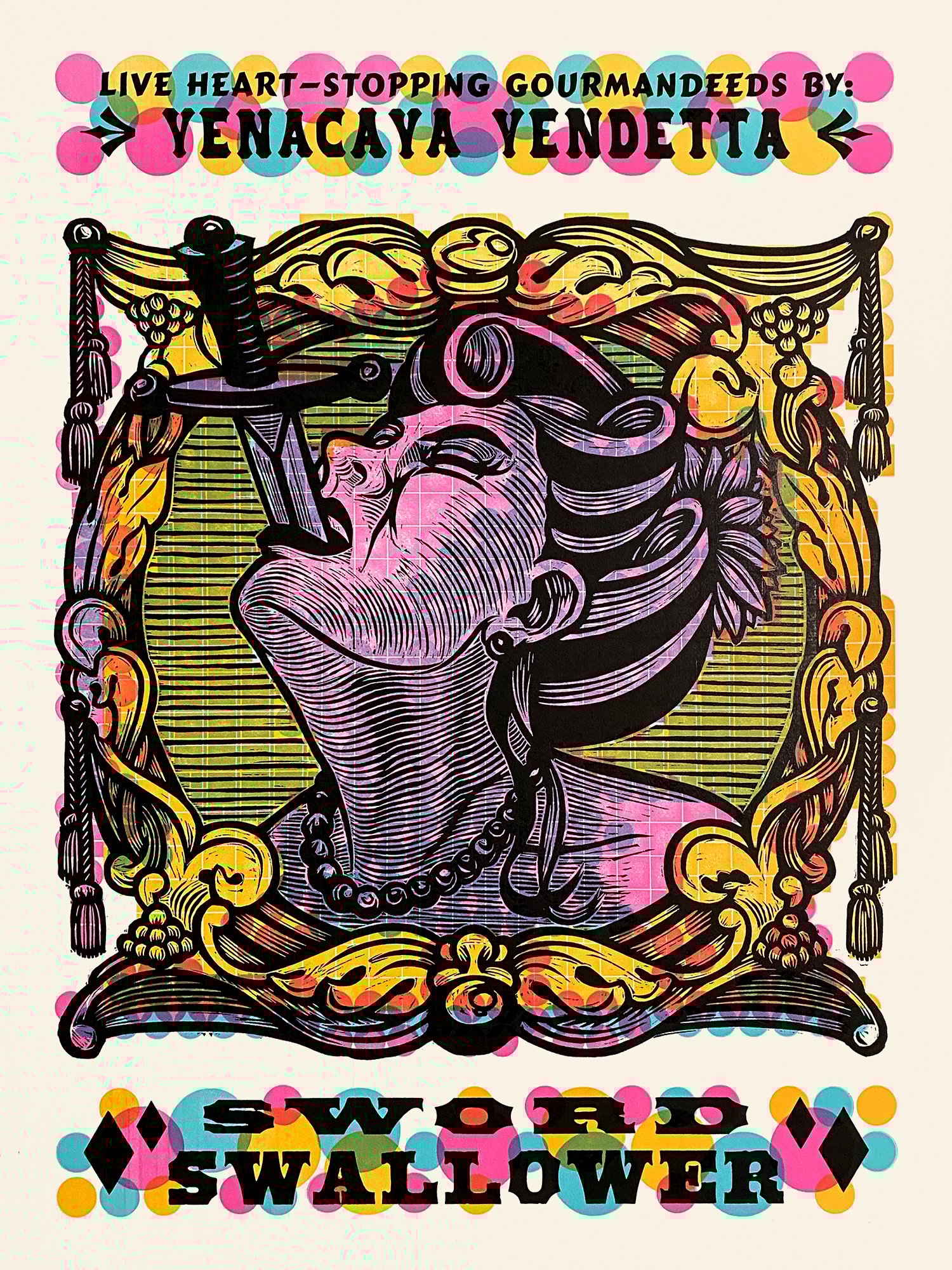One of a series of six sideshow prints to benefit Coney Island USA. 50% of the sales of these prints will go to Coney Island USA and their invaluable arts programming.