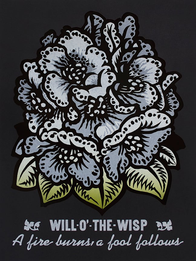 Color Woodcut and Letterpress print, 24" x 18", on French's 100 lb. Cover, Insulation Pink. Handcut, Handprinted with moveable type. Signed. Unframed. Edition of 20.